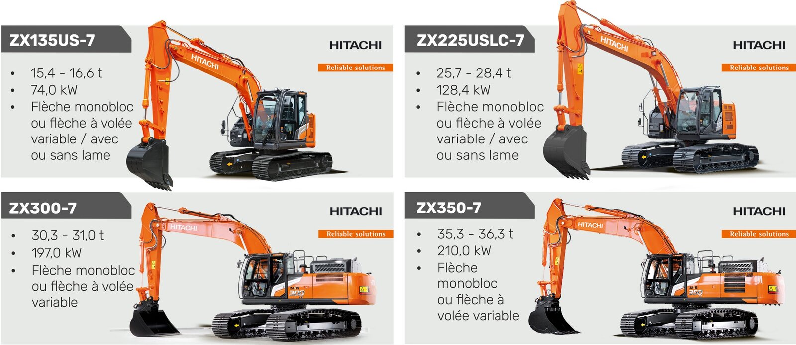 Toutes les machines sont configurables de manière flexible : au choix avec flèche monobloc ou flèche à volée variable. Les modèles à rayon court peuvent être équipés en option d’une lame, idéale pour les chantiers exigus et les interventions en ville.
