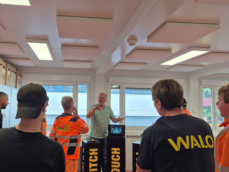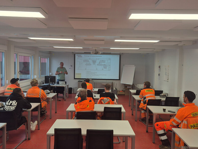 Lors de la livraison, notre formateur Martin Hirschi a dispensé une formation théorique aux machinistes de rouleaux ainsi qu’une présentation pratique complète directement sur la machine. Des chefs de chantier et des machinistes de rouleaux ont participé et se sont familiarisés en détail avec les fonctionnalités, le moteur hybride et les systèmes d’assistance.
