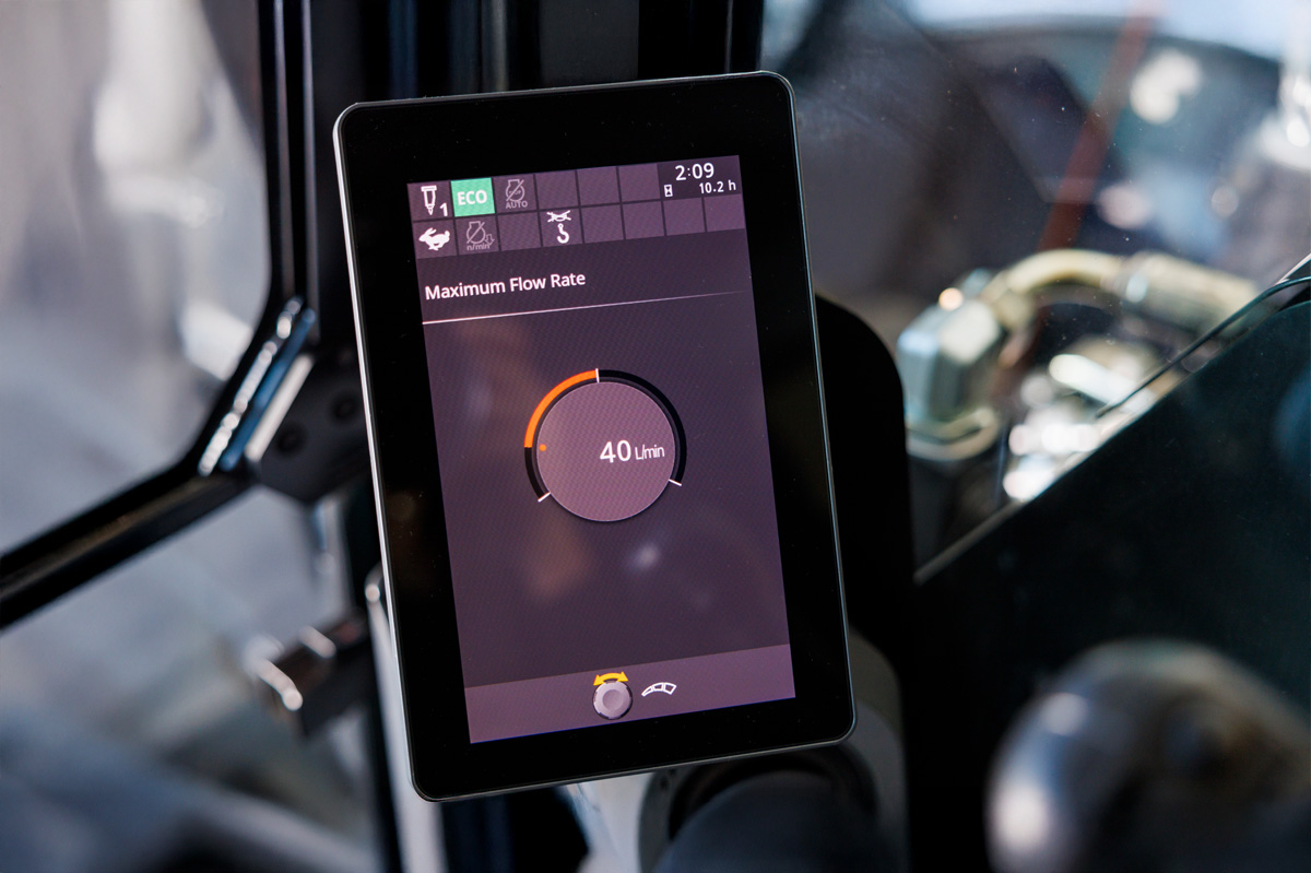 Le système Hitachi Tool Control permet de régler individuellement le débit et la pression d'huile directement sur l'écran. Il est possible d'enregistrer et de configurer de manière optimale jusqu'à neuf accessoires. La machine est déjà préparée en usine pour les systèmes hydrauliques de marteau, de rotation, de pivotement et d'attache rapide.